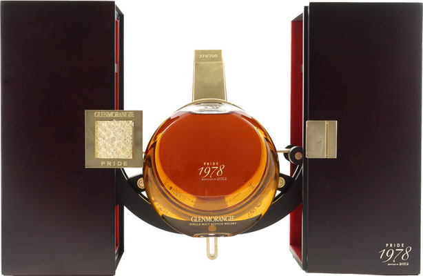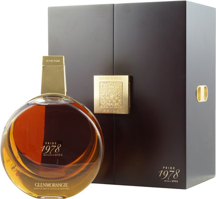 Den 47,4% volumen Glenmorangie Pride 1978 er en udsøgt skabelse af Dr. Ing. Bill Lumsden, Direktør for Destillation og Whisky Creation. Den unikke single malt whisky pride 1978 er en højdepunkt fra sortimentet af fabrikken. Han fik lov til at modne i alt 34 år. 19 år i tidligere Bourbon tønder. Dette blev efterfulgt af den 15-årige finish i rødvin tønder, der tidligere blev opbevaret af fransk premier Grand Cru Claret. Glenmorangie Pride er udelukkende tilgængelig i den begrænsede udgave af 700 flasker, hvilket gør det til en whisky sjældenhed i luksus segmentet. Premium Single Malt Whisky fra 1978 blev aftappet i en fin glaskaffel. Den runde flaske er dekoreret med guldfarvet skrift og en guldfarvet flaskehals. Glenmorangie Pride 1978 er pakket i en rektangulær trækasse med guldfarvet lås. Både den 34-årige single malt whisky samt karafferen og trækassen er af højeste kvalitet. Derudover har hver flaske Glenmorangie Pride 1978 et lille stykke kunst af kunstneren Idris Khan fra Birmingham.